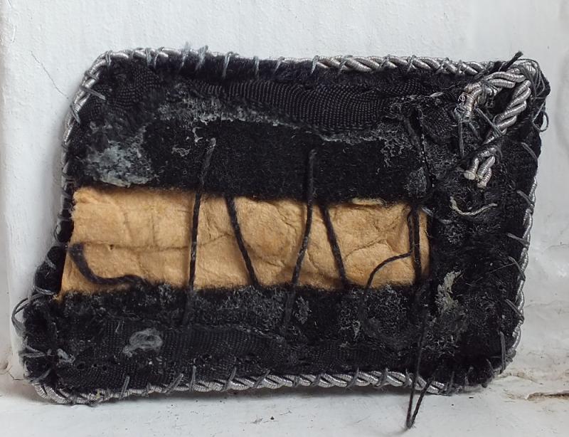 Super tunic removed atmospheric tab, card backing has deformed from service in adverse weather, officer silver piping added presumably in the field.