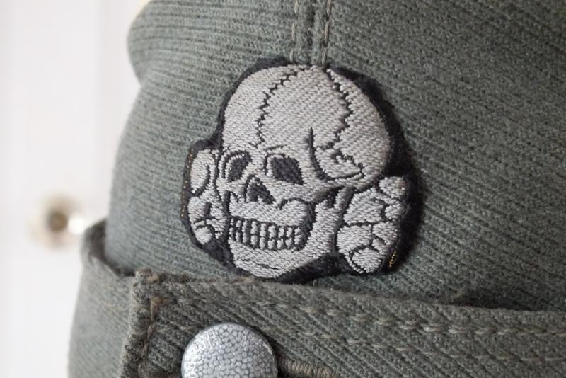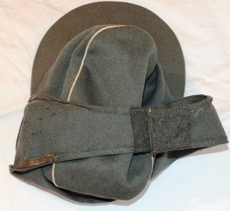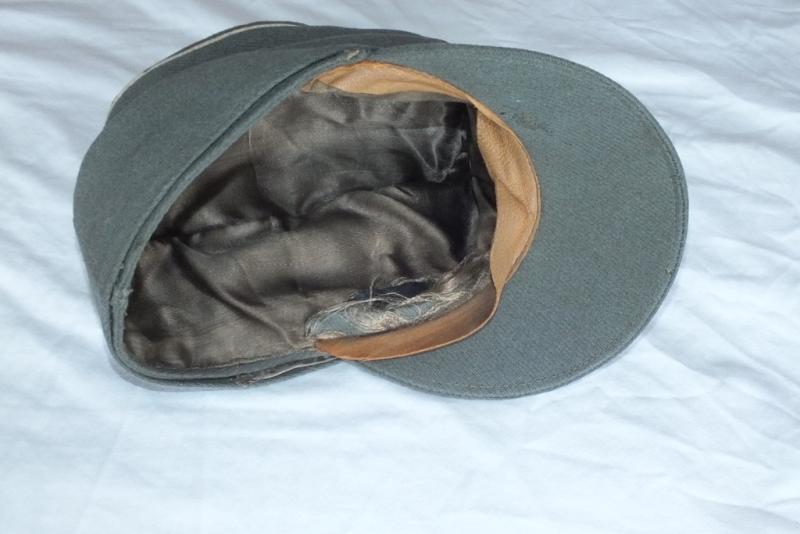 Manufactured in German gaberdine wool with period applied 2 piece BeVo insignia, partial leather sweat band with artificial silk liner which is a little frayed and loose behind the sweatband small size fifty ? Minor damage to peak underside and a small mark to cap top, one closing button replaced, extremely appealing look to this cap in a desirable wool!