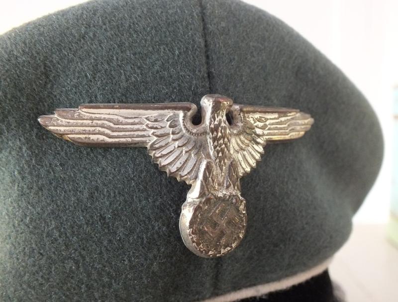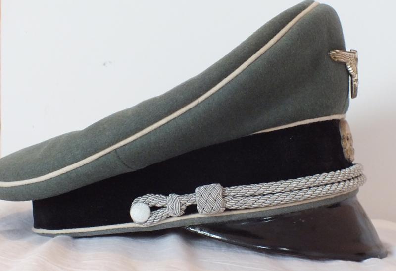 Beautiful moth free heavy moleskin top, quality black velvet band with moth free white piping, matching Cupal insignia, one pin minus to eagle, champaign coloured artificial silk liner shows moderate service wear, ersatz sweat band is typically broken in the normal areas and the peak has at some time separated from the body and has had an unobtrusive adhesive repair to a 1/3 of it.