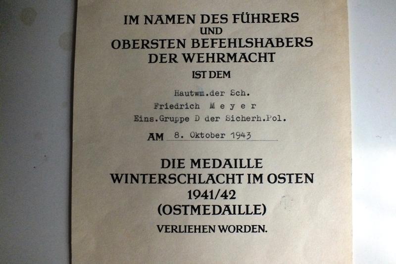 A rare group of six documents to Einsatz Group D. Large size promotion document to Police Hauptwachtmeister dated ‘9th November 1940’ with pen signature of an unidentified General Major of the Police, once folded slight tear. A once folded large size document issued by the Rumanian Government for the Rumanian Crusade against Communism Medal in bronze, also as a Hauptmann Der Schutz Polizei, clearly issued to Eins.Gruppe D.Sicherh.Pol. in the Crimea. War Service Cross 2nd class, A5 size citation for the War Service Cross 2nd class with Swords, dated ‘12th November 1943’ within Einsatz Gruppe D, signed by a Major in the Secret Police with the rubber stamp of the higher police leader Black Sea. A5 size citation, mint, unfolded for the Winter Medal in the East October 1943, same stampings and signature. Large size citation for the 1st Oktober 1938 Medal, a large A5 size citation dated ‘November 1940 stating that Friedrich Meyer is appointed as a State Official for his lifetime dated ‘9th November 1940, some stains at the top and bottom