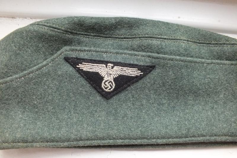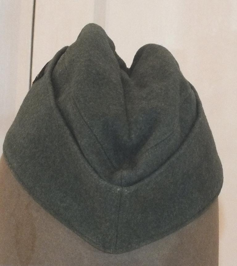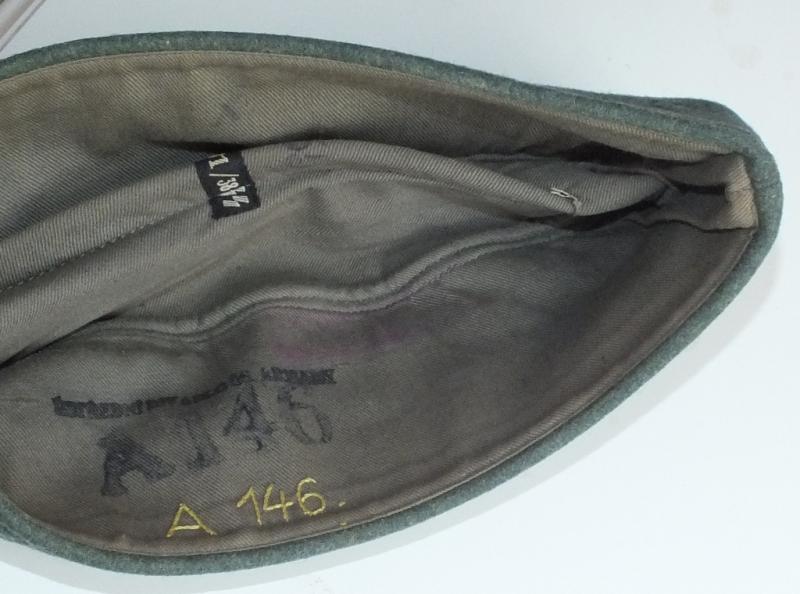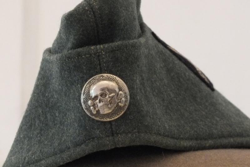 with what may be a theatre company marking also with a hand sewn code, original insignia is retained with machine sewn eagle and nickle skull button, crown has an added seam machine sewn to give the desired 'pinch' early VA/SS tag machine sewn in, exceptionally rare cap !