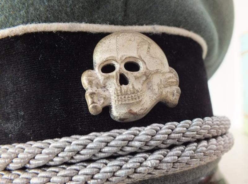 Beautiful moth free heavy moleskin top, quality black velvet band with moth free white piping, matching Cupal insignia, one pin minus to eagle, champaign coloured artificial silk liner shows moderate service wear, ersatz sweat band is typically broken in the normal areas and the peak has at some time separated from the body and has had an unobtrusive adhesive repair to a 1/3 of it.