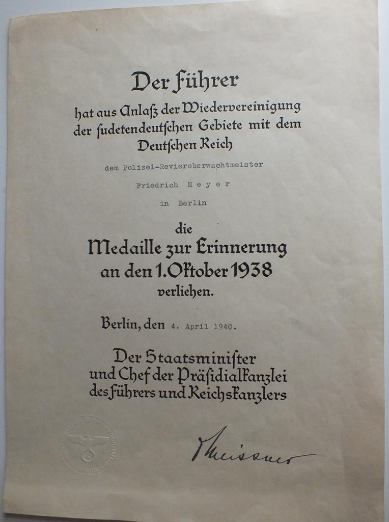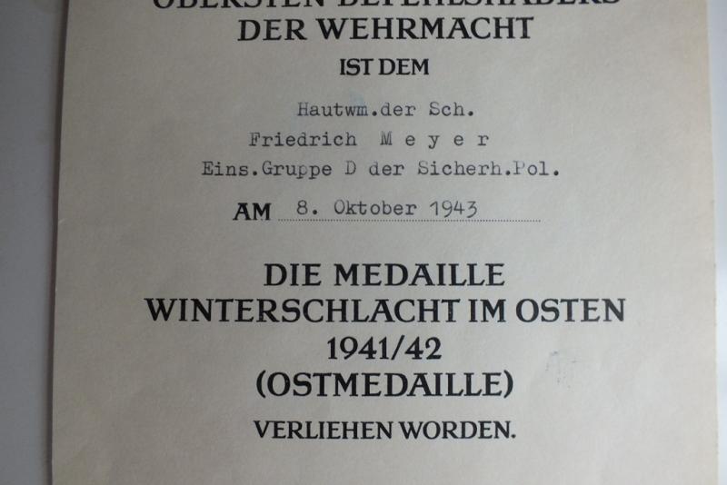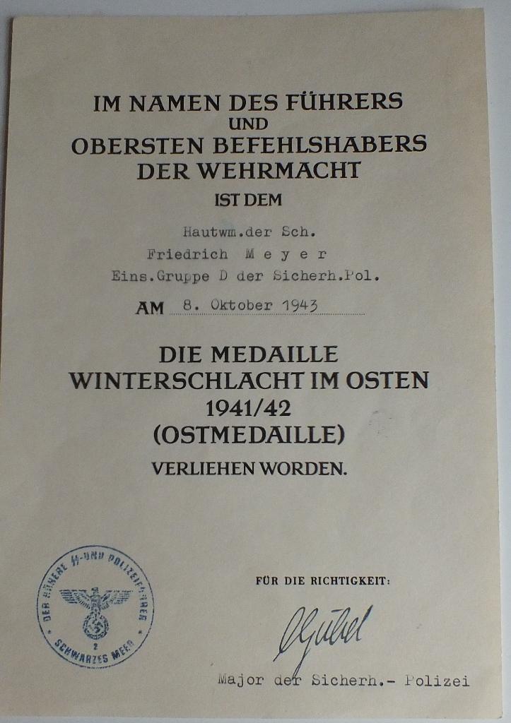 A rare group of six documents to Einsatz Group D. Large size promotion document to Police Hauptwachtmeister dated ‘9th November 1940’ with pen signature of an unidentified General Major of the Police, once folded slight tear. A once folded large size document issued by the Rumanian Government for the Rumanian Crusade against Communism Medal in bronze, also as a Hauptmann Der Schutz Polizei, clearly issued to Eins.Gruppe D.Sicherh.Pol. in the Crimea. War Service Cross 2nd class, A5 size citation for the War Service Cross 2nd class with Swords, dated ‘12th November 1943’ within Einsatz Gruppe D, signed by a Major in the Secret Police with the rubber stamp of the higher police leader Black Sea. A5 size citation, mint, unfolded for the Winter Medal in the East October 1943, same stampings and signature. Large size citation for the 1st Oktober 1938 Medal, a large A5 size citation dated ‘November 1940 stating that Friedrich Meyer is appointed as a State Official for his lifetime dated ‘9th November 1940, some stains at the top and bottom