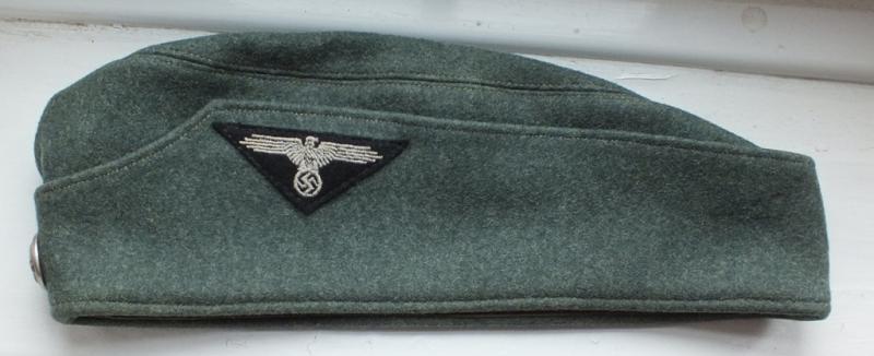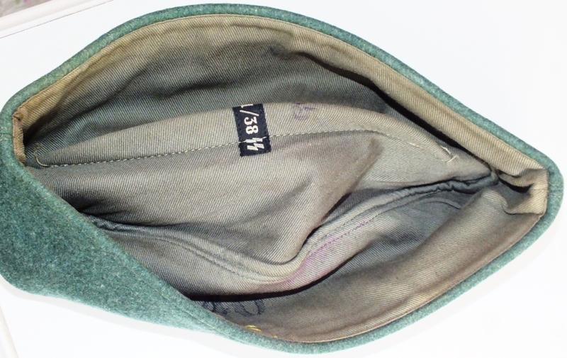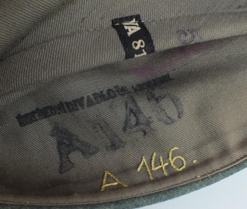 with what may be a theatre company marking also with a hand sewn code, original insignia is retained with machine sewn eagle and nickle skull button, crown has an added seam machine sewn to give the desired 'pinch' early VA/SS tag machine sewn in, exceptionally rare cap !